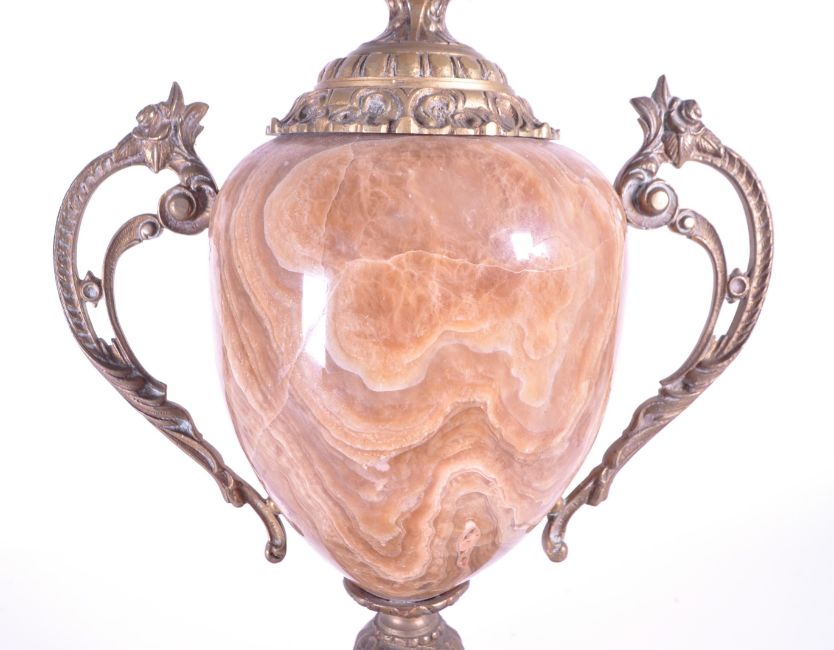 Early 20th century French marble and bronze table lamp. Featuring twin handles and raised on a marble plinth base with three brass bun feet. Louis Philippe style moulded brass mounts and marble body segments. Light fixture atop. Measuring approx. 64cm tall.