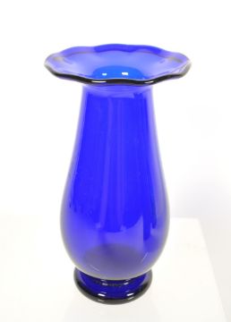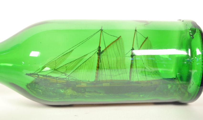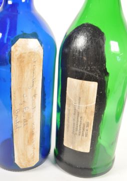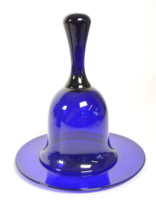 20th century Bristol Blue Glass ship in a bottle 'Westcountry Coasting Ketch 1890 - 1920' by V.G. Lovell, a bell, a plate, a vase and a green glass example also by V.G. Lovell. Plate and vase with artists signature to the underside. Largest piece measuring approx. 30cm x 9cm.