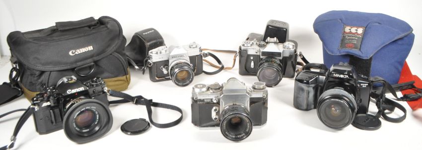 A collection of late 20th century SLR 35mm cameras. To include Fujica ST701, Cosmorex SE, Edixa - Mat reflex, Canon A-1 and Minolta Dynax 5xi.