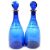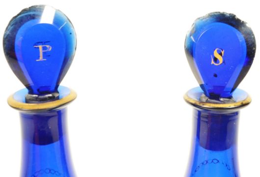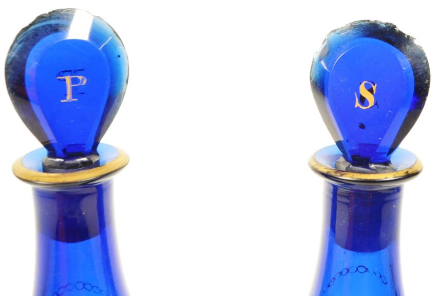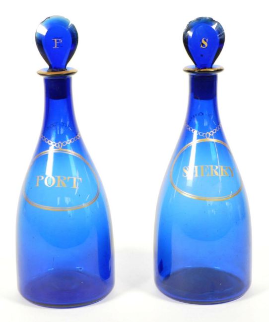 Two late 18th / early 19th century cobalt blue glass decanters with gilt lettering. One labelled Sherry and the other labelled Port with matching stoppers. Measuring approx. 28cm tall.