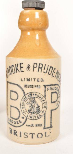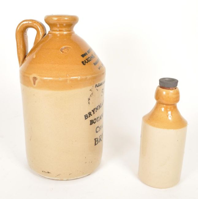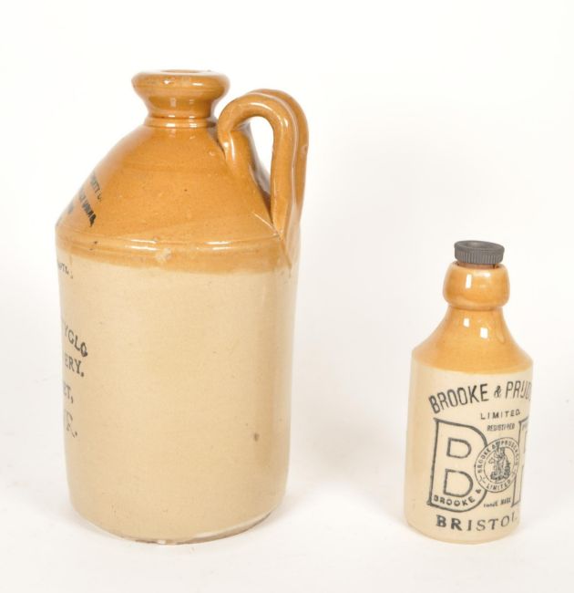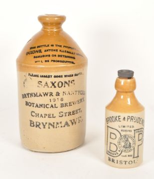 Early 20th century stoneware wine flagons. Saxons Brynmawr & Nantyglg 1916 botanical brewery. Chapel Street. Brooke & Prudencio Limited, Bristol.