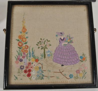 Collection of four 20th century pieces of artwork, including examples such as a needlework piece of a lady in purple, a needlework portrait of a young boy, a print of a young girl in blue, and a watercolour of a woman in white titled 'Moonrise'. Largest piece measuring approx. 39cm x 30cm.