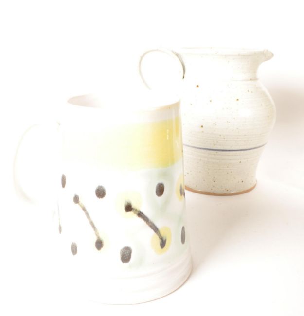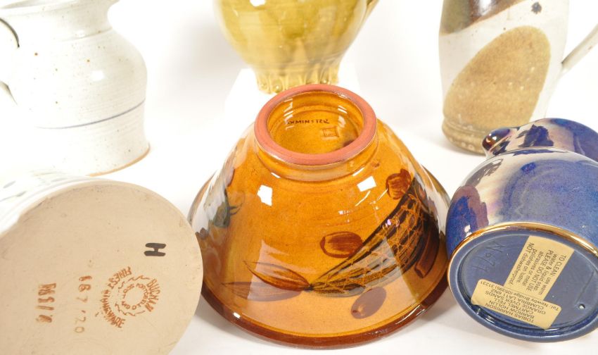 A collection of ceramic studio art pottery. Mainly jugs and one bowl including, Axminster stoneware fish bowl, Simon Leach jug, Buchan, Scotland and Tobias Harrison signed jug. 20cm height approx.