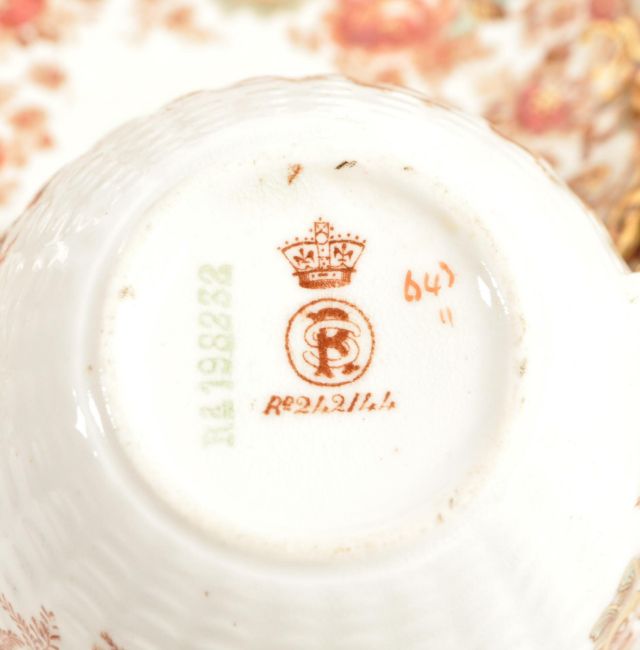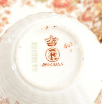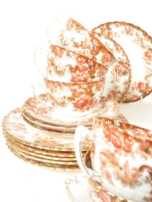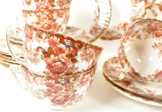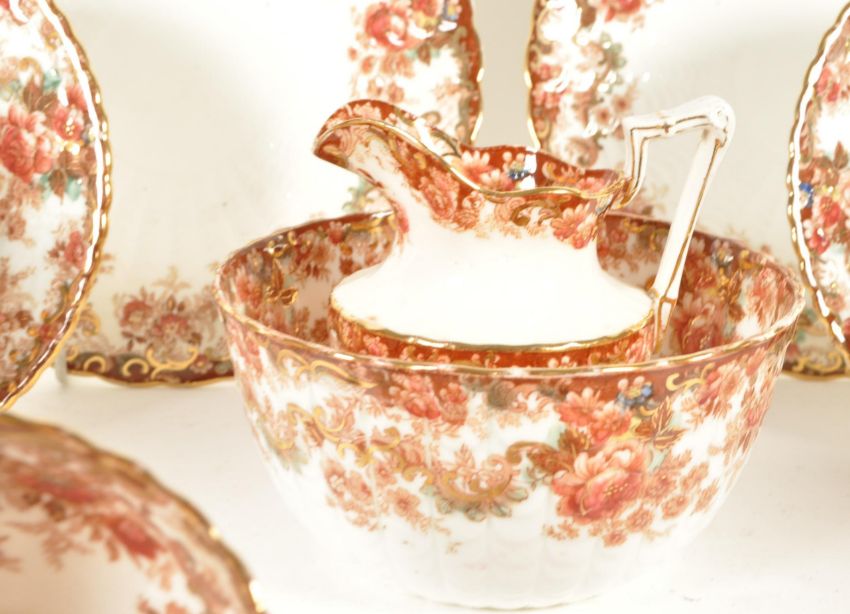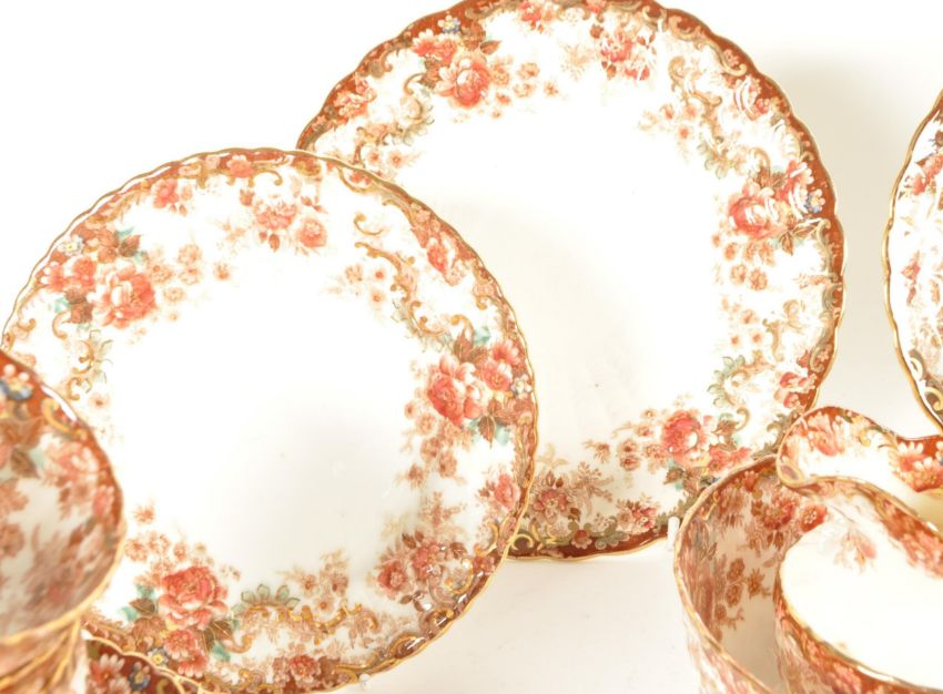 Samuel Radford - Late 19th century Victorian china porcelain tea service, numbered R 242144. Decorated in a brown and burgundy floral transfer pattern with gilt detailing. Comprised of eleven tea cups, ten saucers, milk jug, sugar pot, twelve side plates and two large plates. Makers mark to the underside of the pieces. Sold AF.
