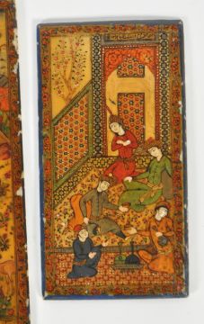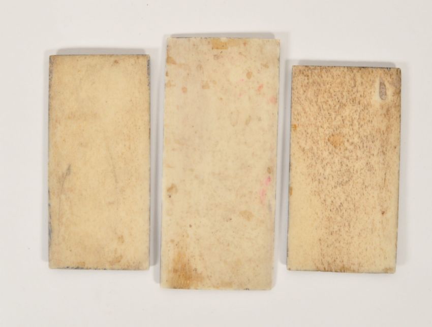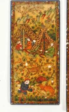 Three late 19th century Persian Qajar dynasty ornate bone painted panels. Each depicting a different scene containing figures, plants, animals and interiors. Largest panel measuring approx. 5.5cm x 12cm.