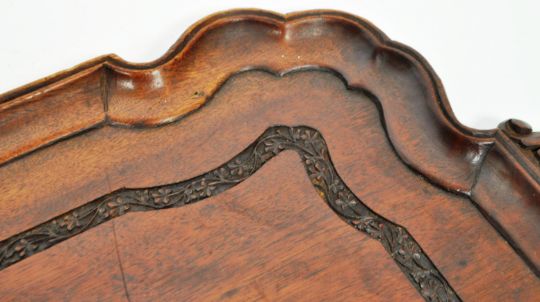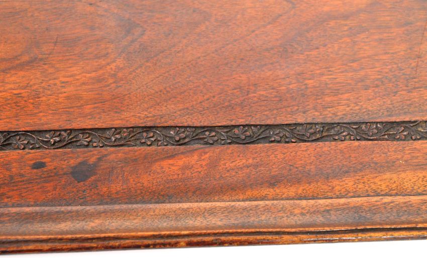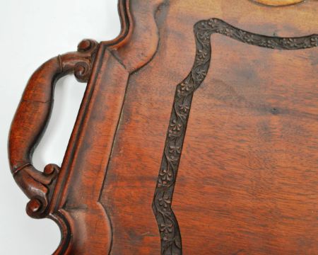 20th century Indian Kashimir carved hardwood serving tray. Features two handles and carved floral motifs to a border. Measuring approx. 31cm x 61cm.