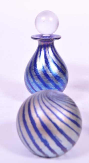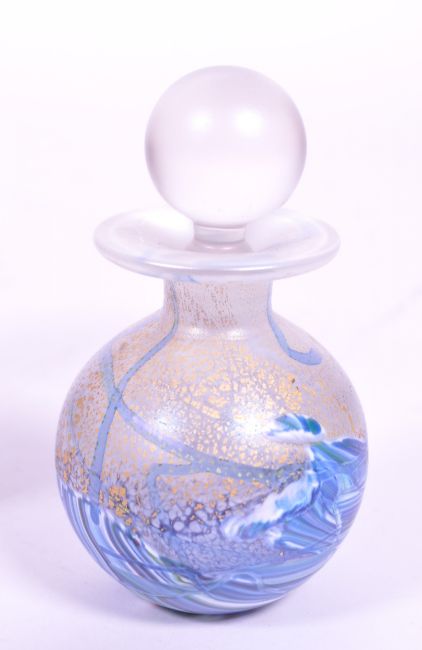 Isle of Wight Studio Glass - Six 20th century perfume bottles and paperweights. Including a gold leaf design paperweight by Michael Harris, a swirl design perfume bottle and paperweight, a black and gold leaf smaller paperweight, an Azurene gold patterned perfume bottle by Michael Harris and William Walker, and a Seascape patterned perfume bottle. All with the Isle of Wight makers sticker to the underside. Largest measuring approx. 8cm tall.