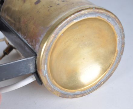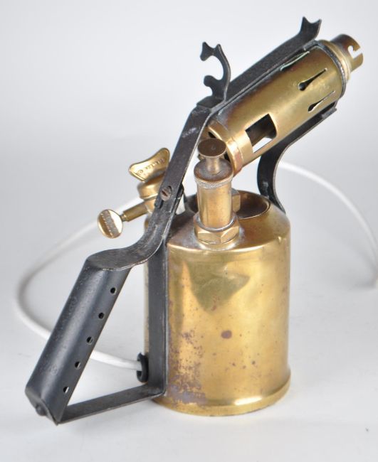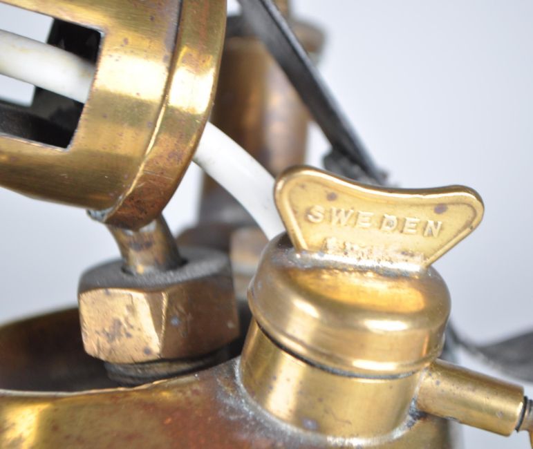 Aktiebolaget Optimus, Sweden - A vintage Optimus No 411 brass blow torch converted to a decorative table lamp / light. With a cylindrical fuel container, metal handle with branded screw valves and light fixing to end. PAT tested. 22cm height approx.Note: please view 'Important Sale Information' for full details of electric items.