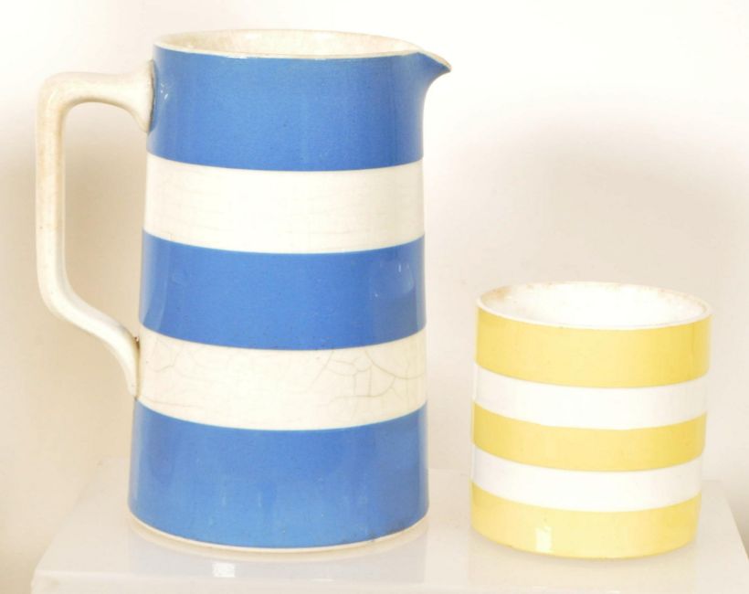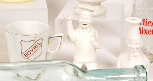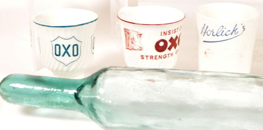 Collection of 19th and 20th century assorted ceramics and glass kitchenware. Examples include a glass rolling pin, an EX-OX cup, two ceramic chef pie funnels, a twin handled Staffordshire Farmers Arms cider mug, Cornishware and more.