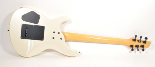Aria Pro II GT series electrics. GT-3 Stringed musical electric guitar. White shaped body with inlaid finger plates and ebonised tuning pegs.