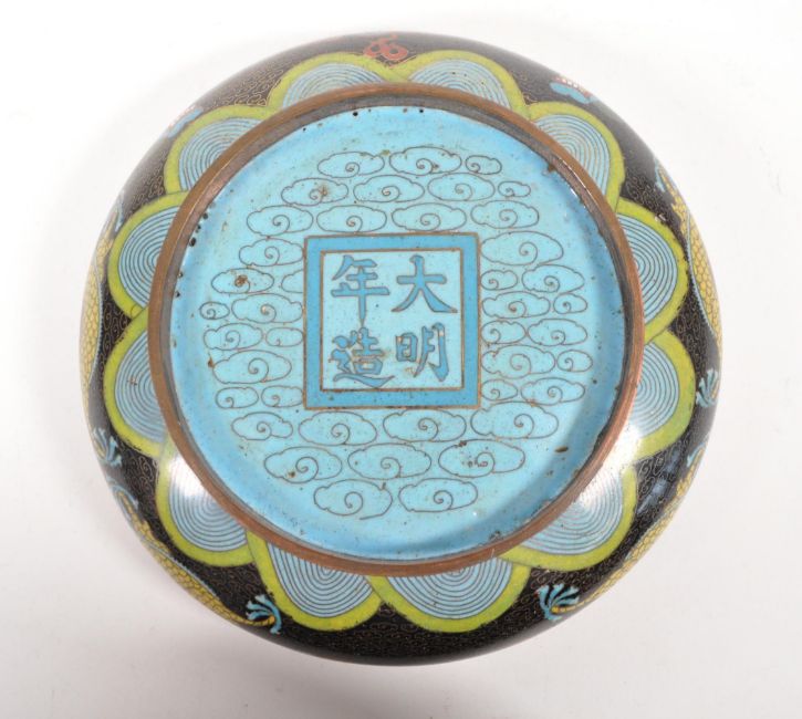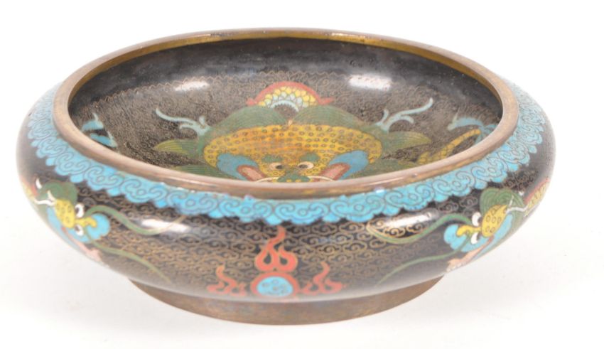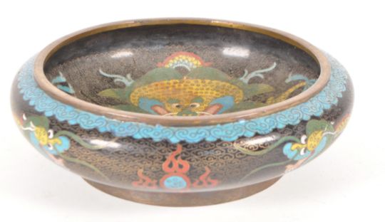 An early 20th century Chinese cloisonne bowl. With large dragon figure to interior and outside. Black ground with blue streaks and metal working.