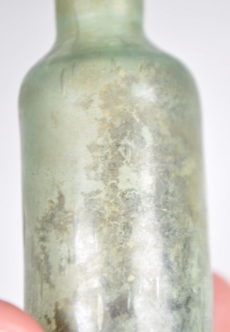 A 17th century glass medicine or scent bottle in green colourway. Discovered during excavation within the city walls of Derry/Londonderry. 8cm height approx.