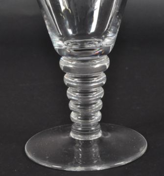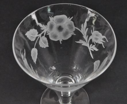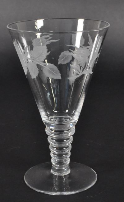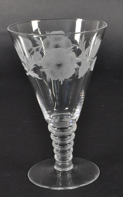 A Stourbridge glass company - Floral etched drinking / cabinet glass. Tapering straight bowl with ring knops on circular foot. Makers stamp to underside.