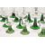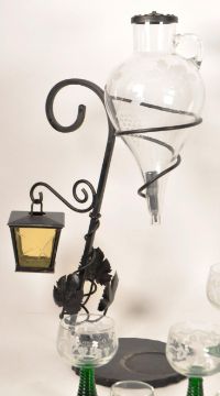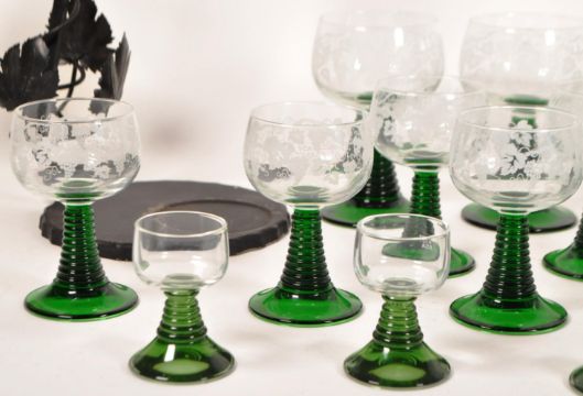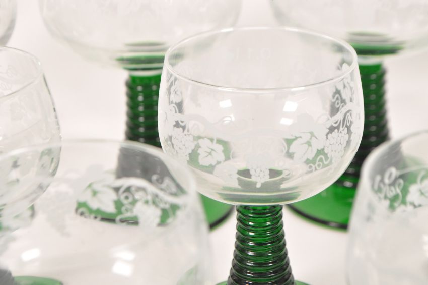 20th century German green stem glasses and table wine dispenser. Comprised of three different sizes of drinking wine glasses, each with green ribbed stems and grape etched bowls, and an iron framed wine dispenser with etched glass bowl atop. Wine dispenser measuring approx. 48cm tall.
