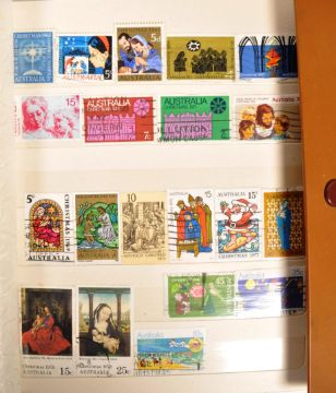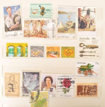 A collection of 20th century circa 1970s commemorative franked Australian postage stamps. Together with a first day of issue, First man landing on the moon stamp 1969. Loose stamps featuring 150th anniversary of Western Australia, Royal Australian Air Force, first telephone transmission, Parliament House Canberra, Antarctica territory, Munich 1972 and many others. Collected and displayed in brown album.