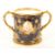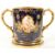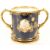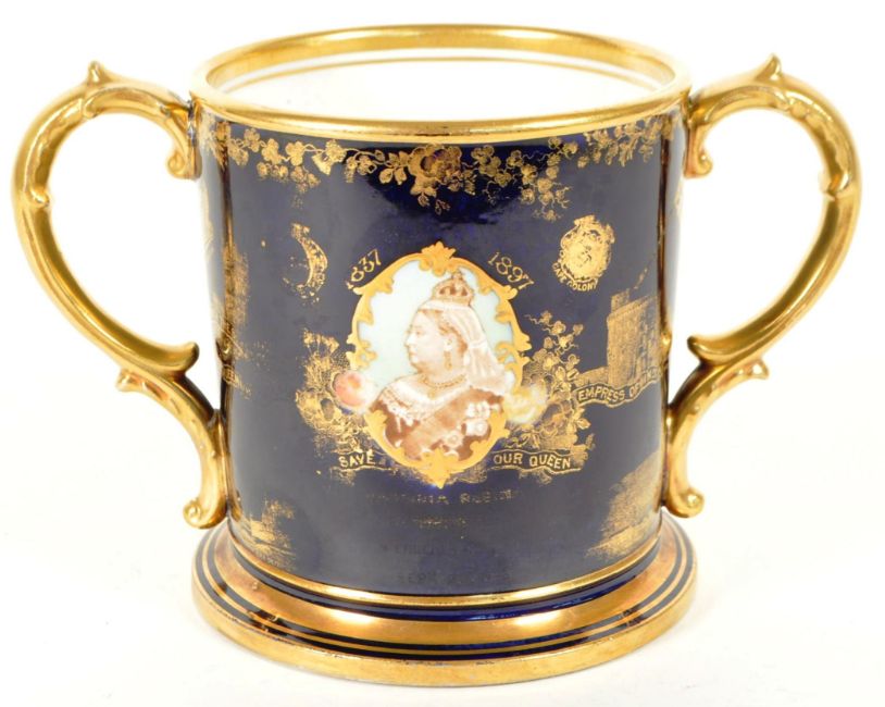 A late Victorian 19th century commemorative twin handled mug. Made by John Aynsley on his 73rd birthday. Gilt and cobalt blue with Queen Victoria panel facing left. With gilt lettering to underside.