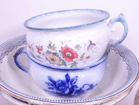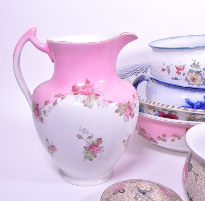 Collection of early 20th century ceramic / porcelain wash set pieces, examples including a Rose Myott semi porcelain chamber pot, a Keeling & Co Meaford bowl and Winton Ware Grimwades part wash set. Featuring wash bowls, chamber pots, jugs and more. Sold AF.