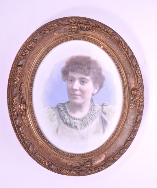 1956 painted photograph of a portrait of a lady in oval gilt painted wooden frame. Dated to the reverse, from Frost & Reed studio ltd. Measuring approx. 38cm x 33.5cm.