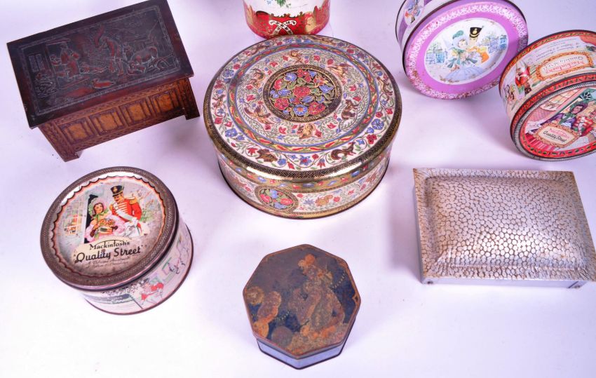Collection of 20th century vintage advertising metal lidded tins, comprised of two Mackintosh's Quality Street chocolate tins, a Jacob & Co's coffer shaped lidded tin, a George W. Horner & Co lidded tin, a Cadbury's milk assorted chocolate biscuit lidded tin, a J.S. Fry & Sons Ltd lidded tin, and more. Largest box measuring approx. 8.5cm x 21.5cm.