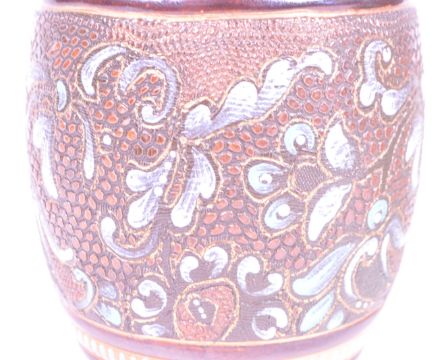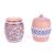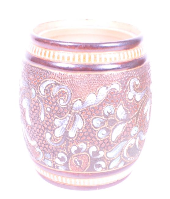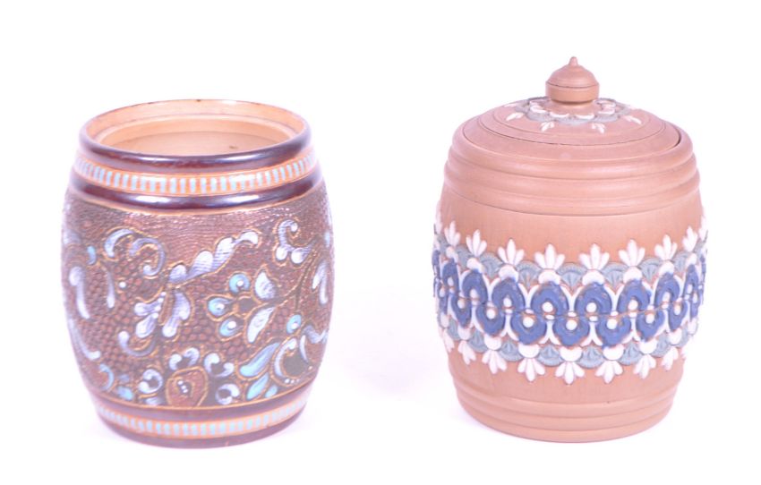 Two late 19th century Doulton Lambeth stoneware tobacco jars, comprised of a lidded tobacco jar in a brown colourway with blue and white decoration, and an unlidded tobacco jar in a brown colourway with blue and gilt decoration. Makers marks stamped to the underside of both pieces. Largest measuring approx. 14cm x 10cm.
