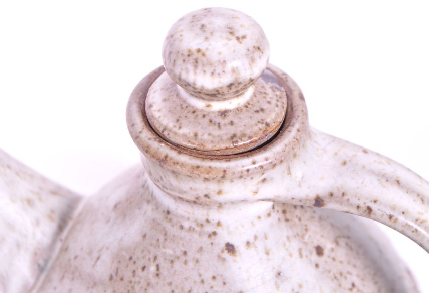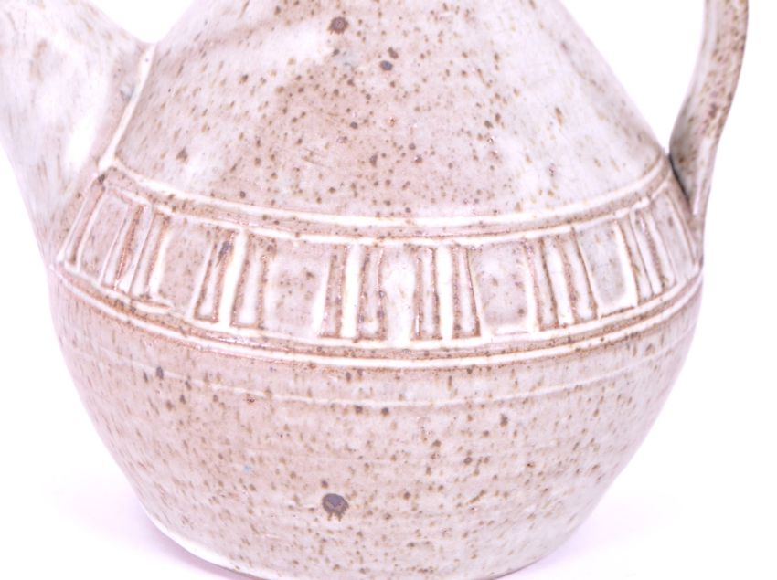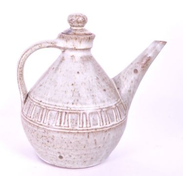 Eric Golding for Branscombe Pottery - A vintage 20th century studio art pottery teapot in earthenware tones with banded detailing. Shaped spout and handle. Impressed maker's marks below the handle. Measures approx. 23cm x 21cm.