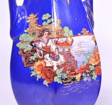 A pair of Edwardian ceramic chinoiserie twin handled vases. Featuring a blue colorway with a transfer design to the main bodies of a traditional Chinese scene with hand painted gilt detailing. Hexagon base and tapering form upwards with two square handles. Unmarked. Measuring approx. 30cm x 14cm.