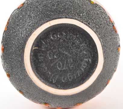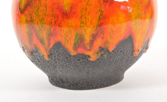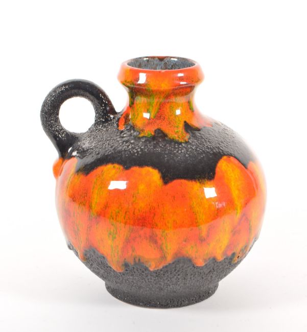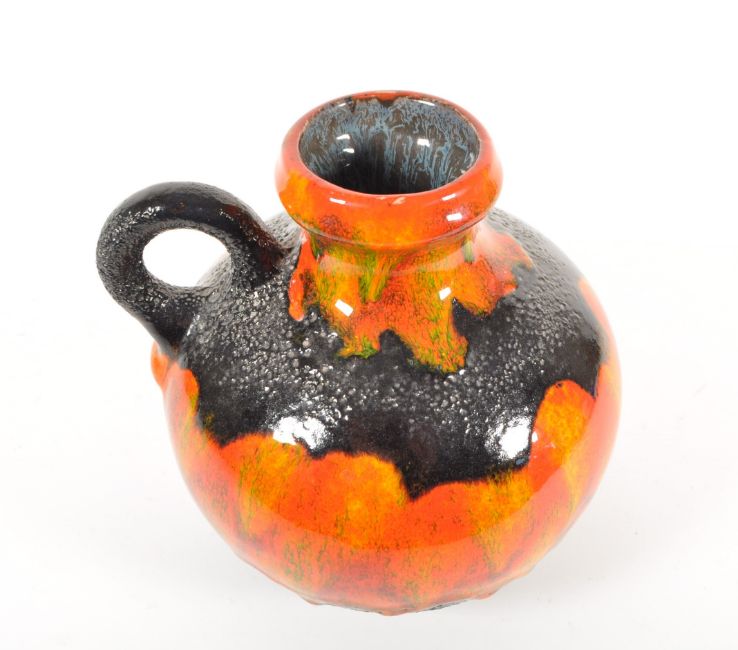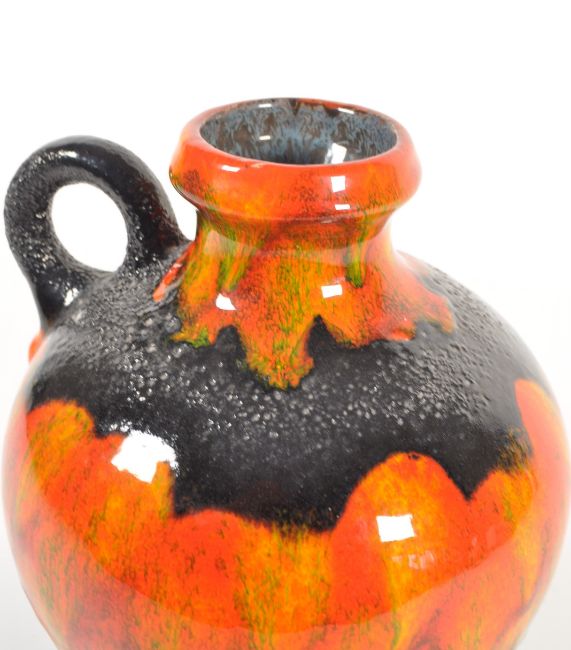 Mid century vintage West German fat lava squat single handled vase. Featuring an orange / red vibrant glaze against a textured black colourway. Makers mark to the underside and numbered 20/270. Measuring approx. 19cm x 18cm.