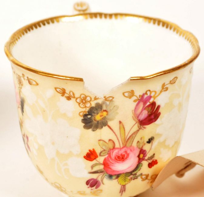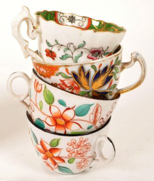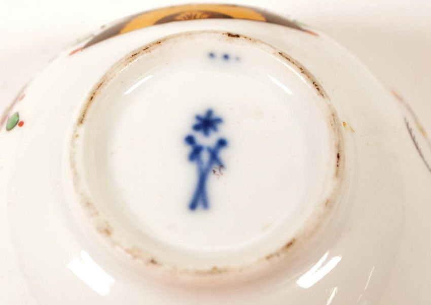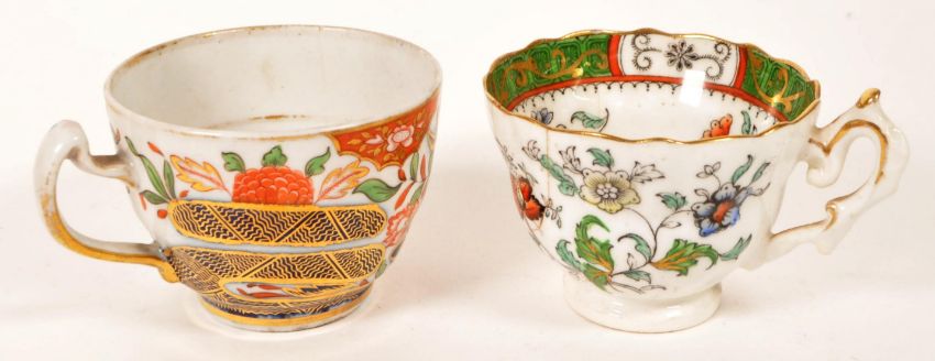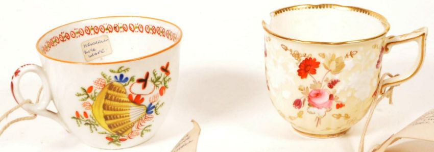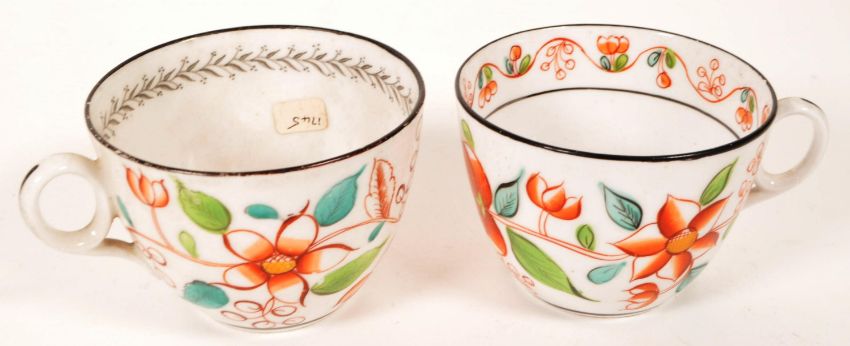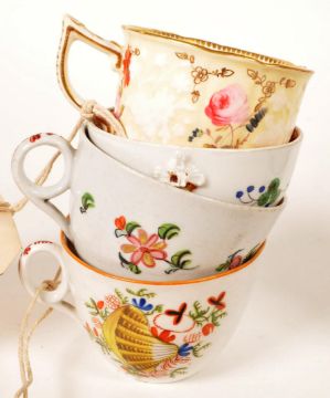 Collection of eight 18th / 19th century china tea cups. Comprised of a Chamberlains in Worcester tea cup in the pattern Thumb and Finger, two New Hall hand painted tea cups, a C J Mason hand painted tea cup, a Meissen Marcolini tea cup with makers mark to the underside, New Hall tea cup in the Yellow Shell pattern, a Rockingham factory tea cup and a New Hall hand painted tea cup. Largest piece measuring approx. 6cm tall. Sold AF.