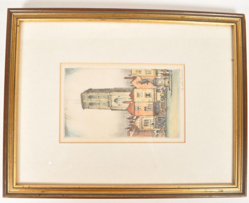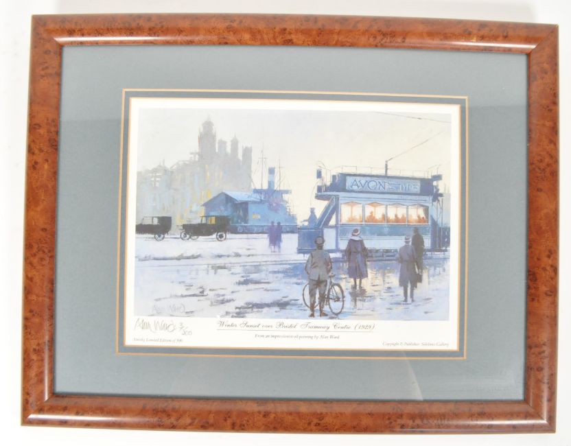 Collection of three 20th century prints of Bristol interest. Comprised of a coloured etching of Temple Church by E. Sharland, signed in pencil to the bottom right corner, an engraving of The North Front of the Exchange at Bristol, and a limited edition of 500 print titled 'Winter Sunset over Bristol Tramway Centre (1929)' from an impressionist oil painting by Alan Ward, signed and numbered in pencil to the bottom left corner. All pieces framed, mounted and glazed. Largest measuring approx. 35cm x 45cm.