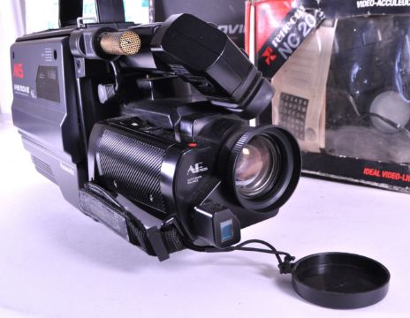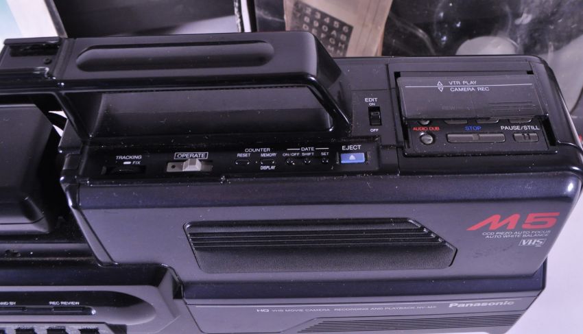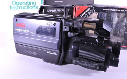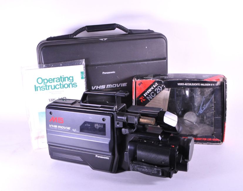 Panasonic - 1980s VHS NV-M5 series hand held recorder and playback video movie camera. Housed within the original case with instructions and video AC Adaptor VW-AM5. Also with a boxed reflecta NC 20 video-acculeuchte halogen 6 V / 20 W.