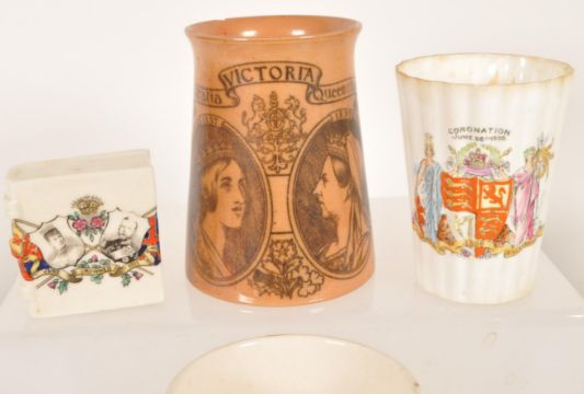 Late 19th / 20th century china porcelain Royal commemorative tea cups, saucers, and more. Including a Foley China sixty years of Queen Victoria tea cup and saucer, a W.H. Robinson Longton King Edward coronation tea cup and saucer, a Willow Art crested book figure, a Doulton Lambeth ceramic Queen Victoria commemorative cup, and more. Most with makers marks to the underside. Largest piece measuring approx. 10.5cm x 10cm.
