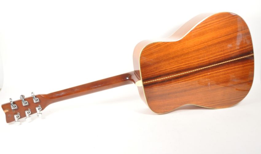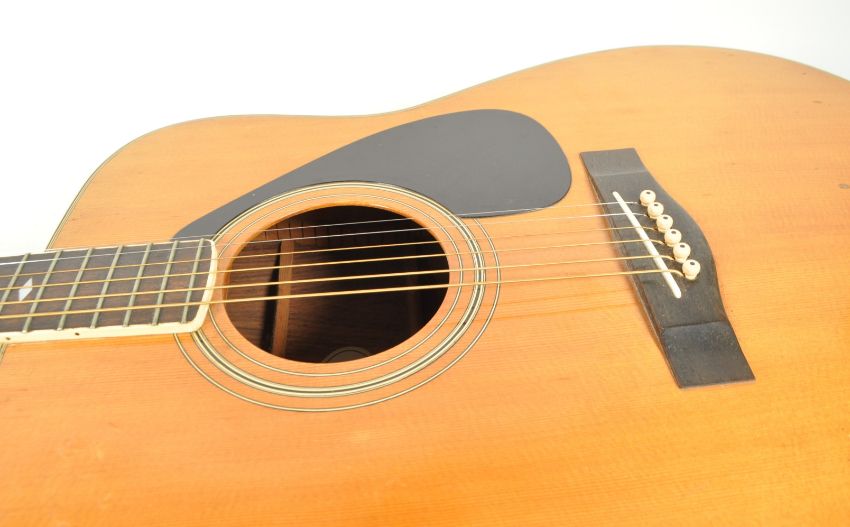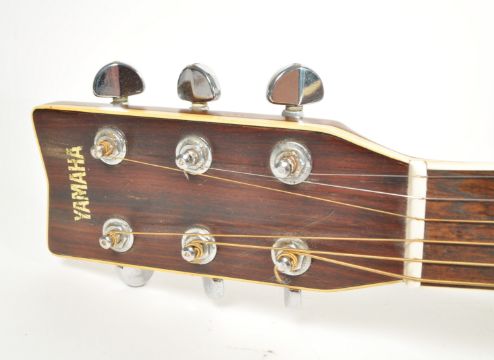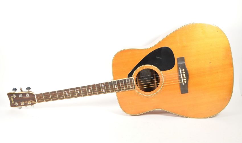 1970s late 20th century Yamaha FG-345 II acoustic guitar. Featuring a wooden frame, mother of pearl diamond shaped inlay to the fret board, black pick guard and makers mark to the headstock. Measuring approx. 102cm in length.
