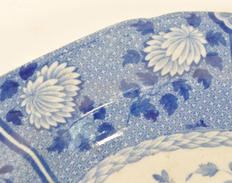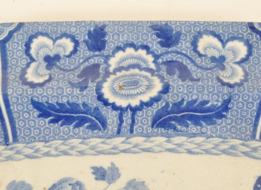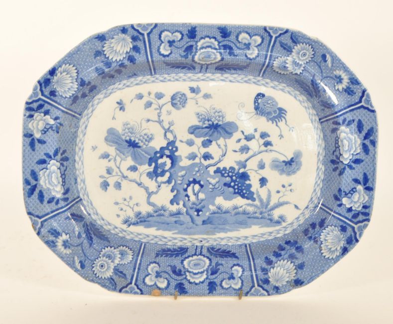 Spode - 19th century earthenware blue and white platter. Decorated with a transfer Indian pattern depicting floral motifs and butterfly. Spode mark stamped to the underside of the piece. Measuring approx. 42.5cm x 33cm.