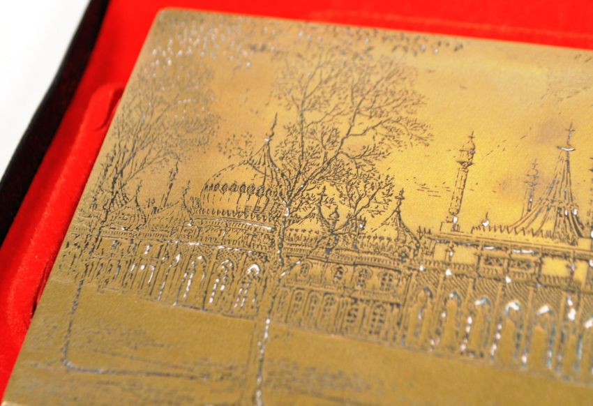 A 20th century The Royal Pavilion Brighton brass tone plaque paperweight. The plaque featuring an etched design of The Royal Pavilion at Brighton. Housed in a display case.