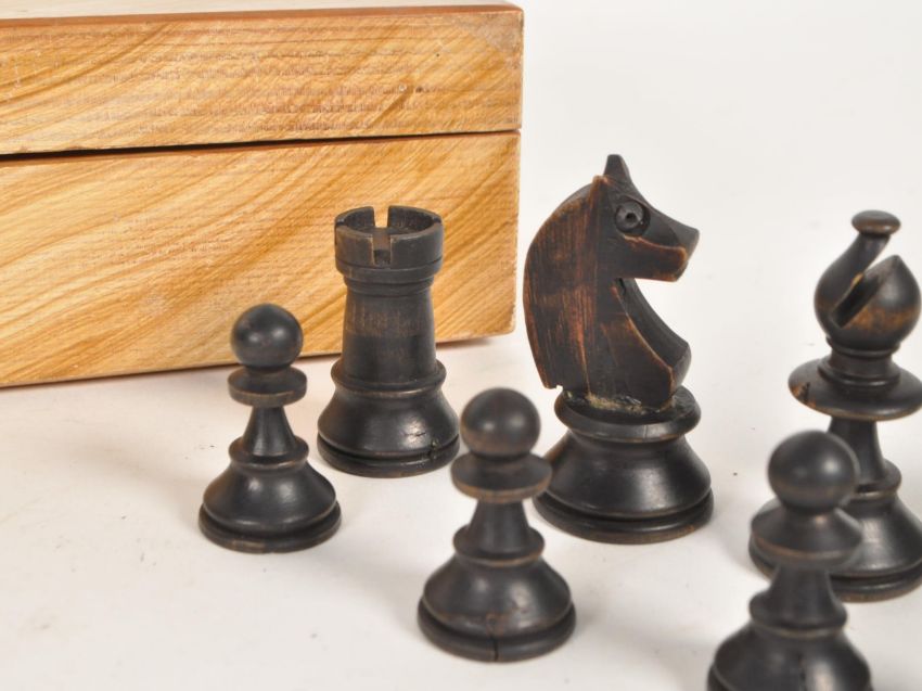 A vintage 20th century chess set with pieces. Turned beech wood black and white colourway, incomplete in case. King measures approx. 6cm.