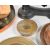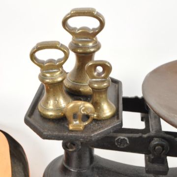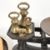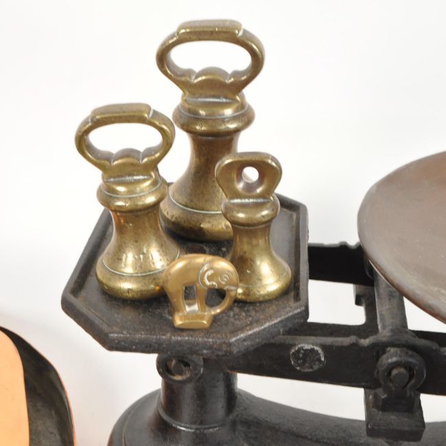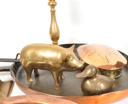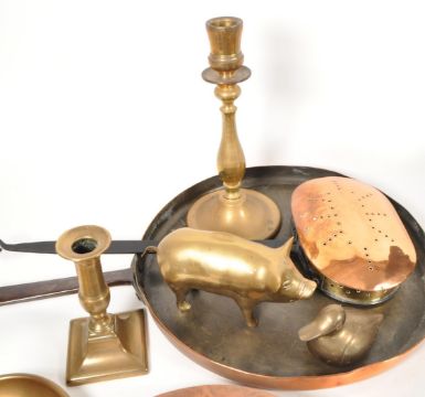 A collection of 19th century brass & copper items. Including a large iron and copper skillet pan, brass candlesticks, brass weighing scale weights, dish, and brass duck.
