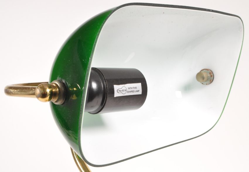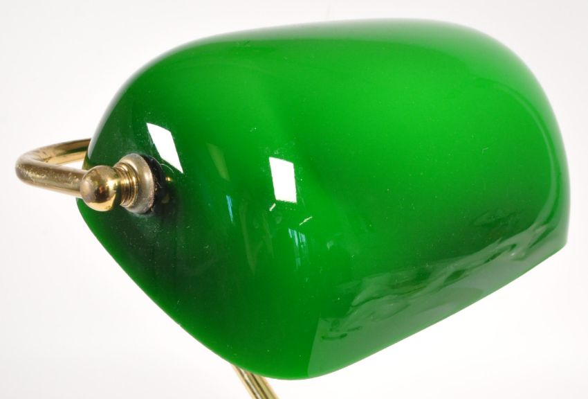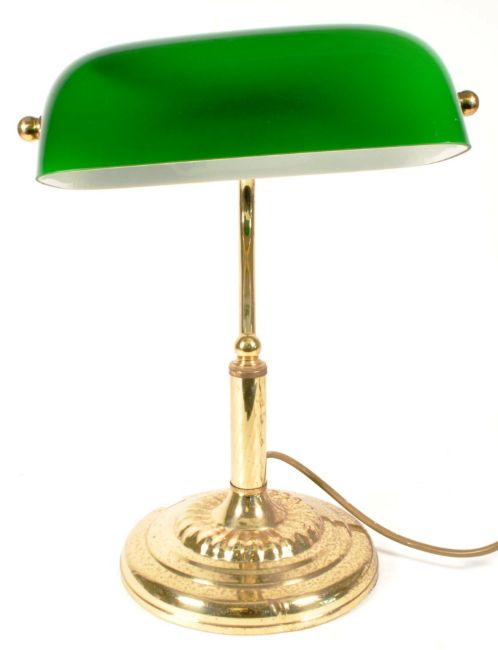 20th century bankers lamp with gilt metal stand with adjustable green and white glass shade atop. Measuring approx. 36cm height approx.