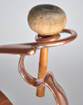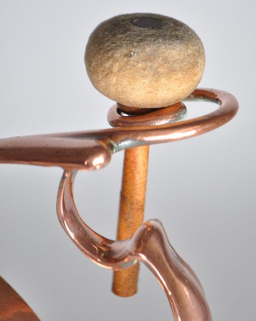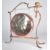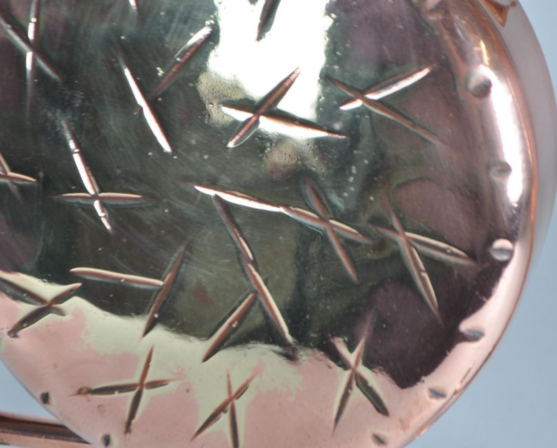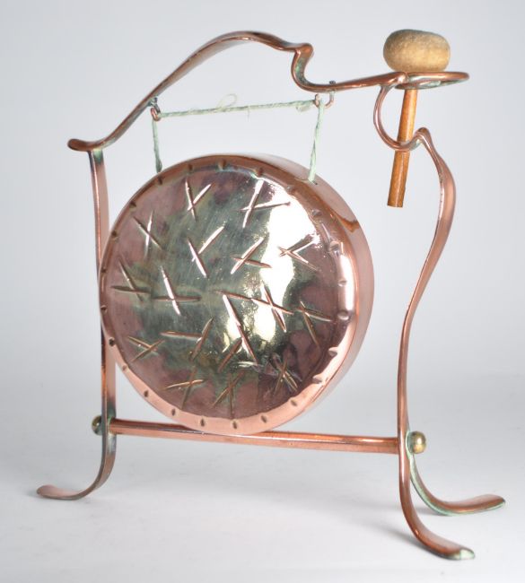 A late 19th century Arts & Crafts table top brass dinner gong. Of copper construction being raised on splayed legs having an circular gong complete with the strike. 26cm height approx.