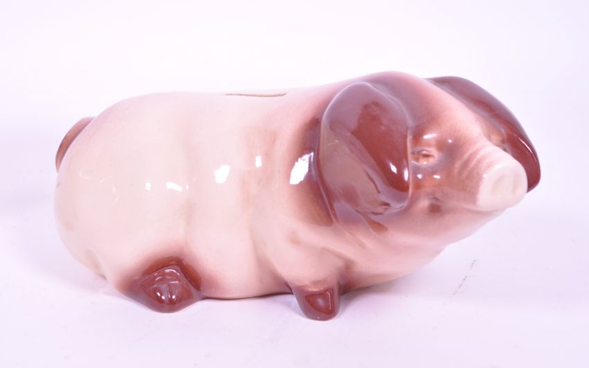 Two late 20th century ceramic pig figures, comprised of a Tamworth piggy bank and larger white and pink pig figure. Largest measuring approx. 18cm x 30.5cm.