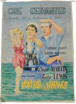 Cinema - a collection of x3 c1940s / 1950s Spanish made cinema posters - 'Sailor Beware' starring Dean Martin & Jerry Lewis, 'Sirroco' starring Humphrey Bogart, and The Blue Dahlia starring Alan Ladd. Variation printed artwork - based on the original paintings from the Spanish studios. Flat. Measures approx: 42cm x 30cm.