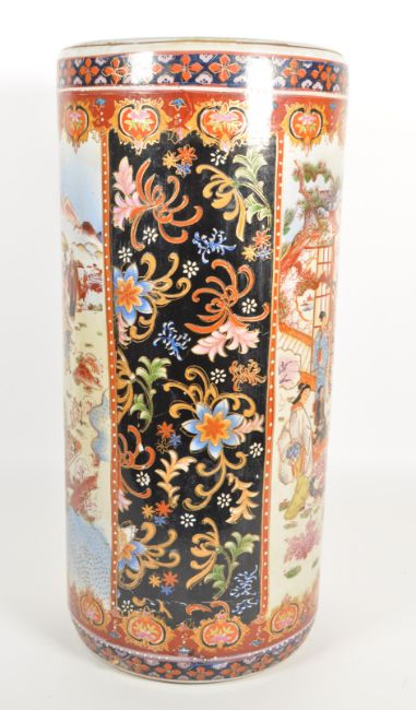 20th century Japanese Satsuma china porcelain vase and umbrella stand. The vase decorated in hand painted traditional Japanese figures and floral motifs with gilt detailing. The umbrella stand decorated in transfer design Japanese figures, landscape and floral motifs with gilt detailing. Largest measuring approx. 45.5cm tall.
