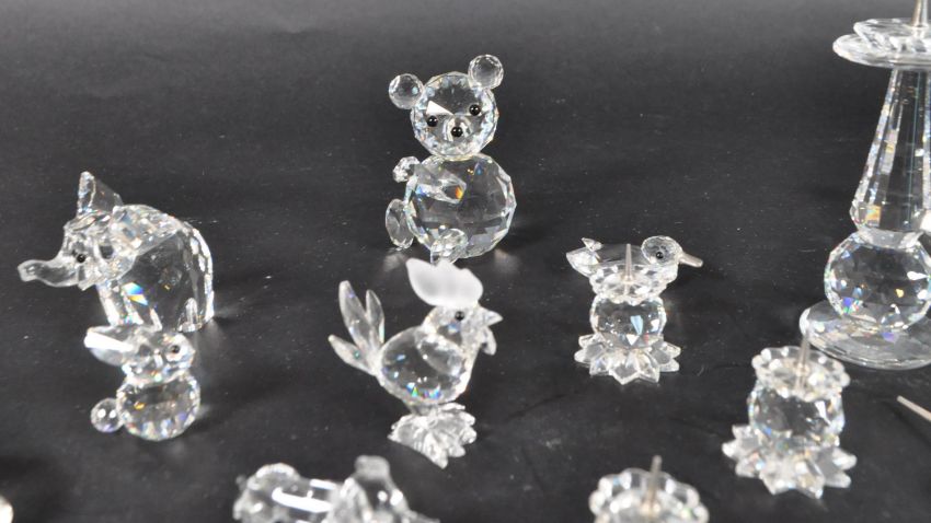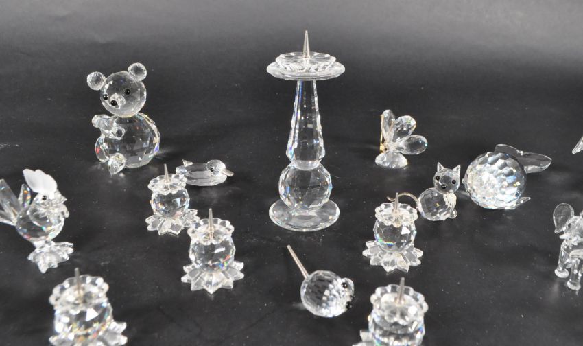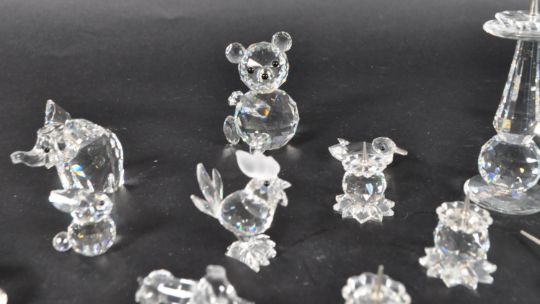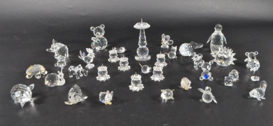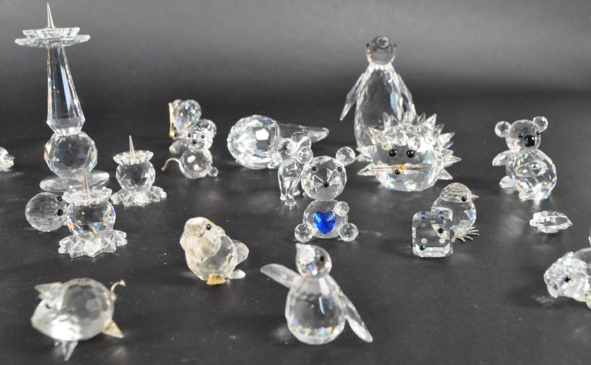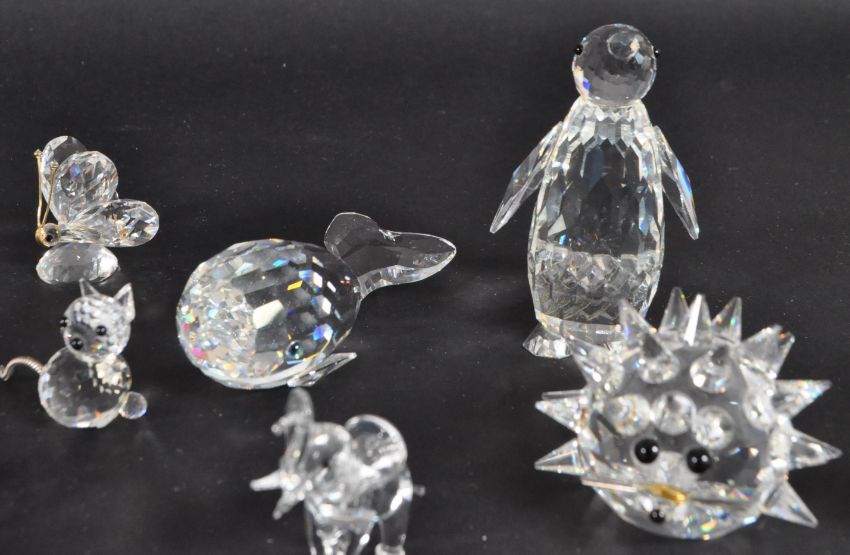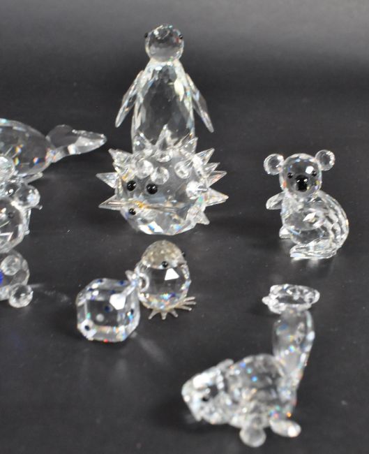 Swarovski - Collection of late 20th century crystal glass animal figures. Examples including a snail, hedgehog, elephant, seal, penguin, bird, elephant, cat, turtle, and more. Most with makers marks to their bases.