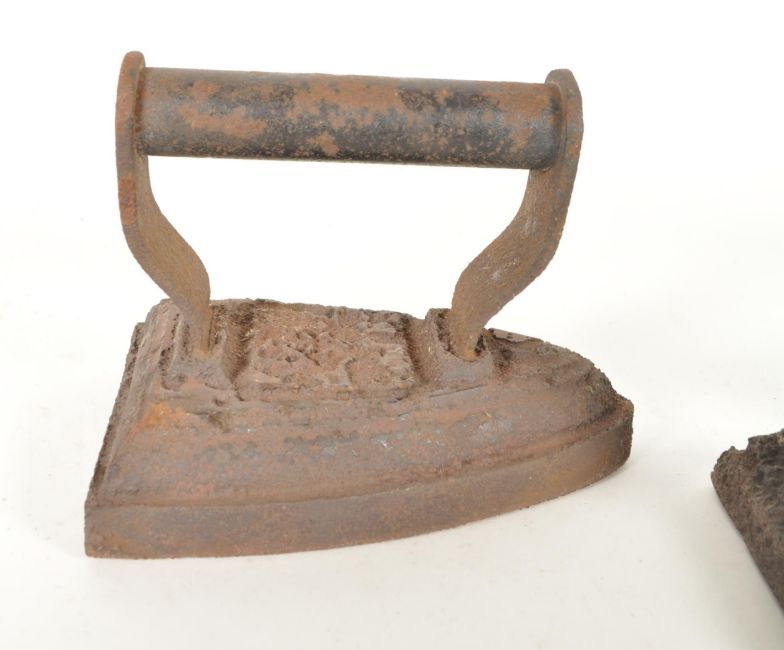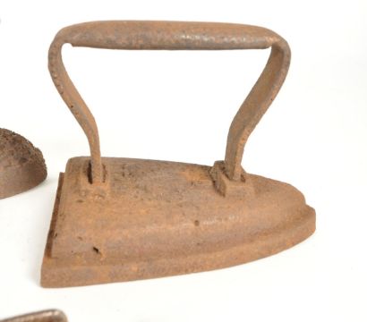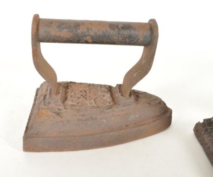 A collection of 19th century irons - To include four examples with brass trivet iron holders. With carry handles and turned wooden handle.