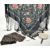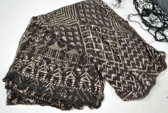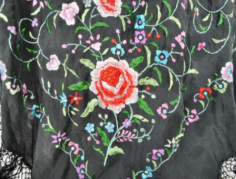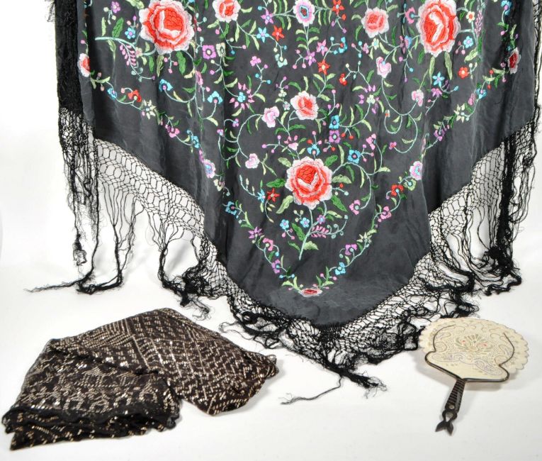 20th century Chinese silk shawl, Egyptian Wedding Shawl and Malaysian hand fan with carved horn handle. Chinese silk shawl decorated with embroidered floral motifs and black tassels to the edges, Egyptian wedding shawl with silver coloured geometric patterns on a black ground and the hand fan with pierced hand painted design to the main body.