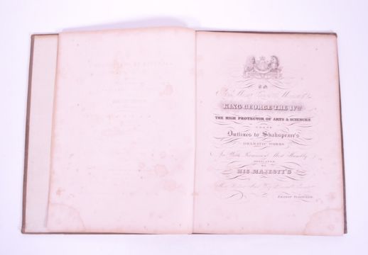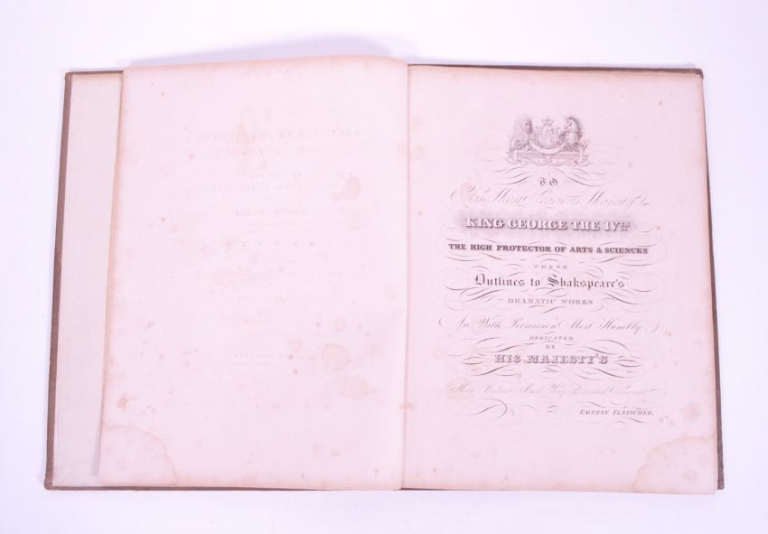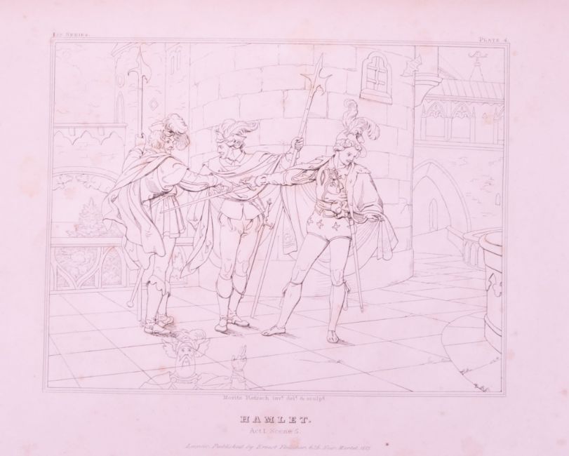 After Friedrich August Moritz Retzsch (1779-1857) - 1828 hardback book of Retzch's Outlines to Shakespeare, the First Series: Hamlet. Consisting of seventeen published plates by Ernest Fleischer. Each act and scene includes an engraving and an English, German and French translation of the text. Measuring approx. 35.5cm x 27cm.
