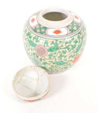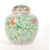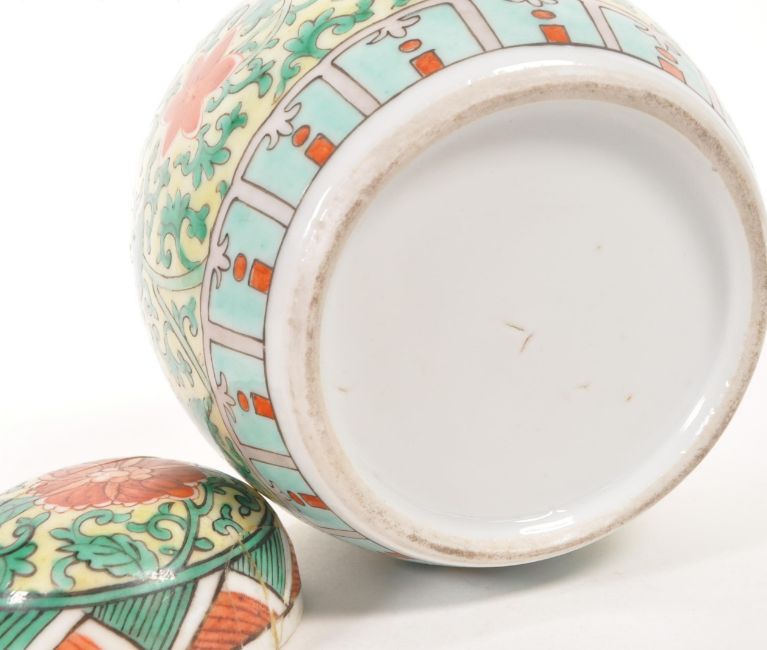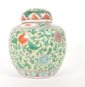 A 19th century Chinese porcelain ginger jar. Famille rose design with floral pattern in green colourway against a yellow ground. Repair to lid. No marking to underside.