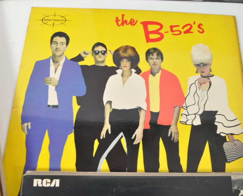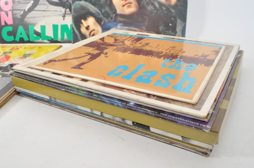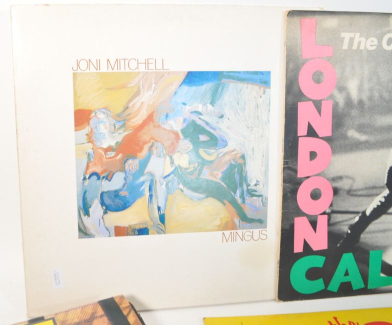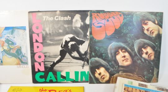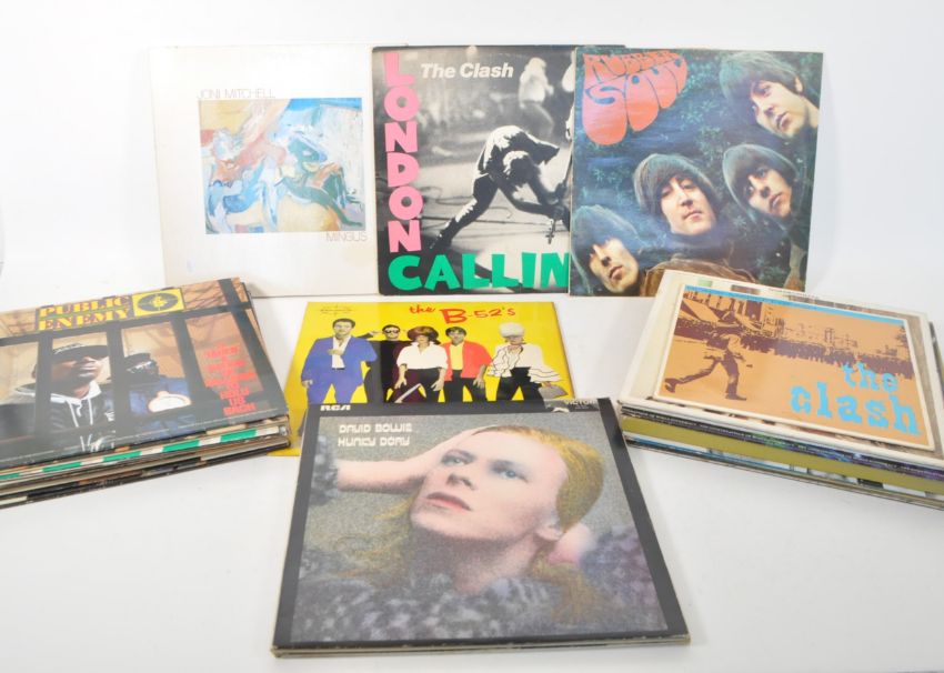 Collection of late 20th century vintage LP vinyl records. Featuring artists such as David Bowie, Joni Mitchell, Squeeze, The Beatles, The Who, Bob Dylan, The Clash, The Talking Heads, The B52's, and more. Examples including Hunky Dory RCA Victor SF 8244, Rubber Soul stereo PCS 3075, Songs For Drella 799-26140-1, London Calling CBS Clash 3, and more.