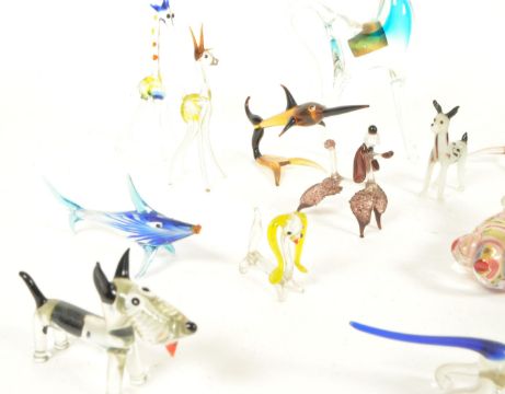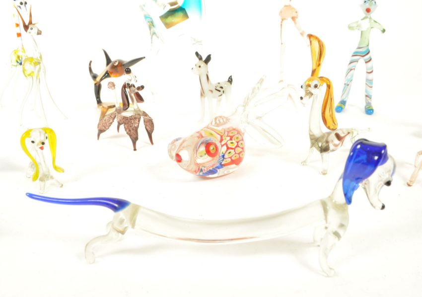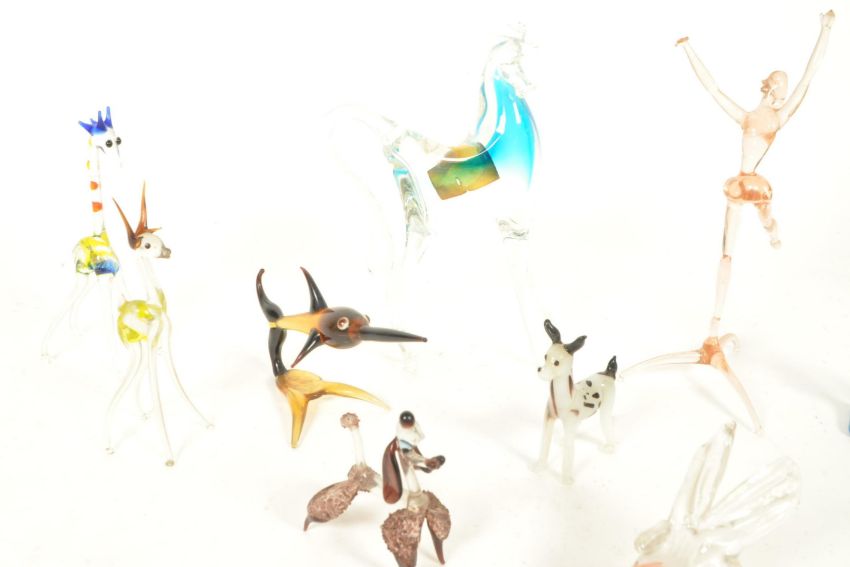 Collection of 20th century Murano style glass animal miniature figures. Examples including a branded Murano blue and clear glass horse figure, fishes, dogs, deer, giraffe, and more, also including human figures. Largest measuring approx.18cm x 10cm.