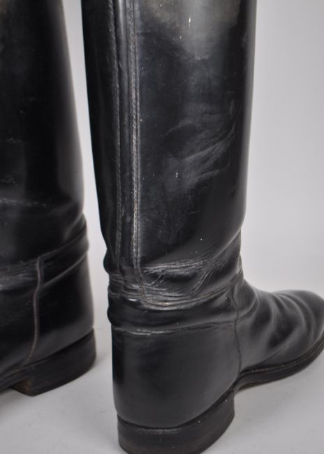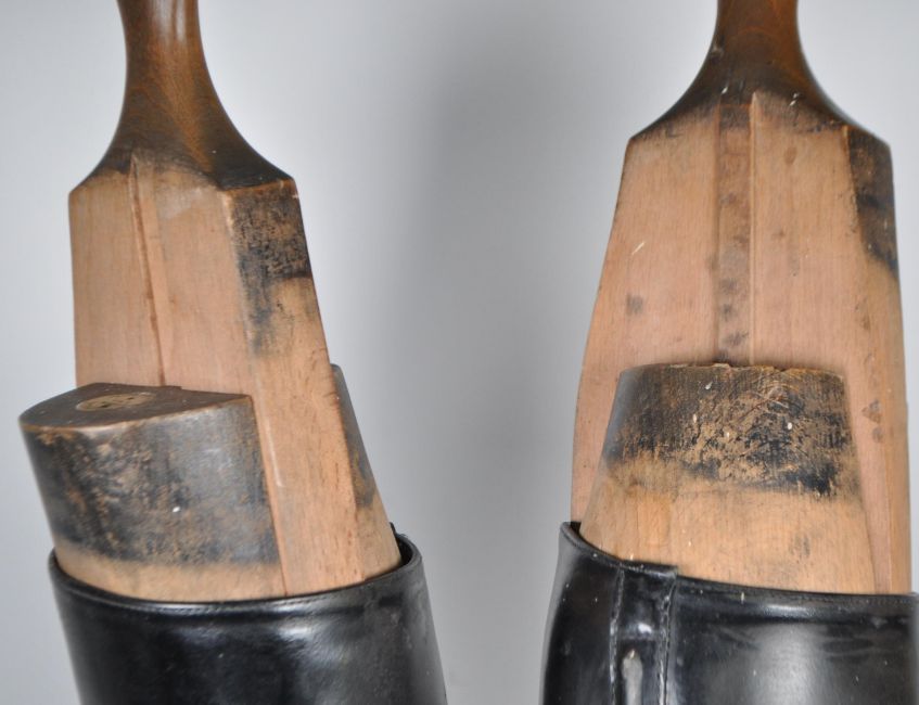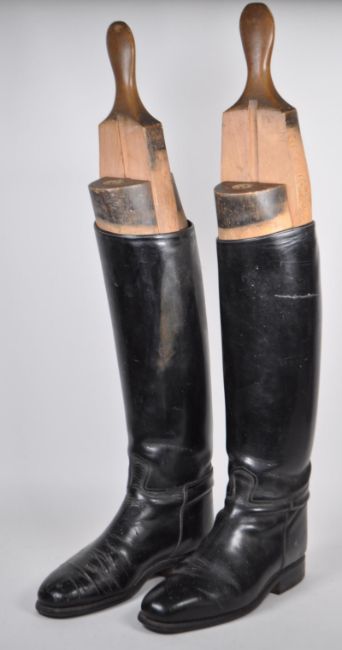 Tom Hill, London - Pair of Edwardian leather riding boots. With wooden tree inside and maker's plaque to top. SW1 Knightsbridge. Boot with marker's mark to underside. 73cm height approx, toe to heel, 28.5cm approx.