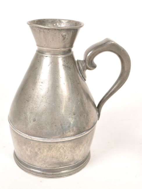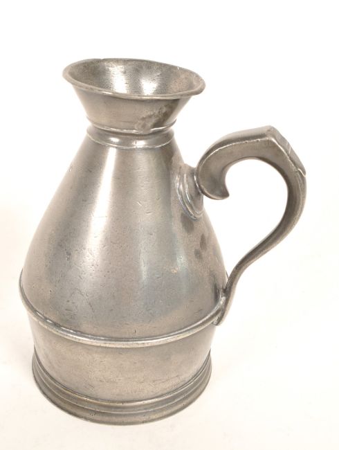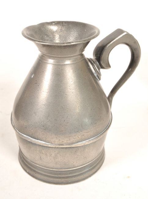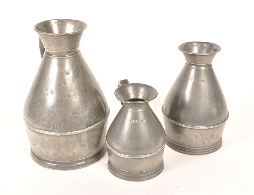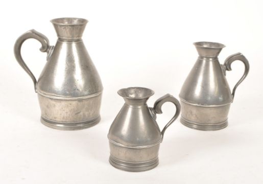 Austen and Son Co. - A set of three 19th century Irish pewter haystack jugs / measures. Each of graduating size, measuring 1 Pint, 1 Half Pint, and 1 Noggin. The jugs of rounded form, with flared rims to top, and handle to side. Each stamped to base, featuring measure to side.